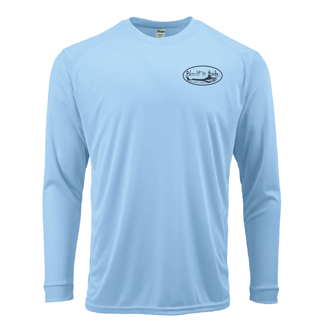 Two sided, Dri-fit, UPF 50, long sleeve surf shirt with Blackfin logo on front and Florida map on back.